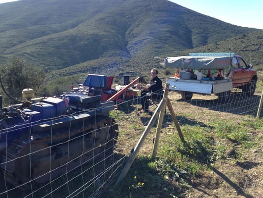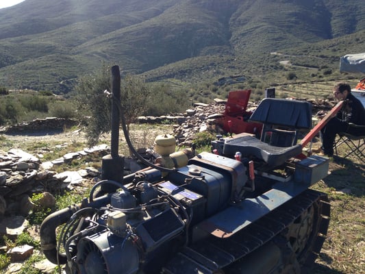 Christopher schaut was der Dieselpumpe des Lamborghini Traktors in Cadaques fehlt, mit traumhaften Blick auf das Meer.....