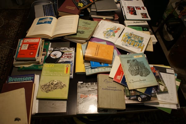 Viel Anschauungsmaterial wird gerade für die Kurse zusammen gestellt. Werkstatthandbücher, Lehrmittel und viele alte Autoprospekte laden zum schmökern ein !
